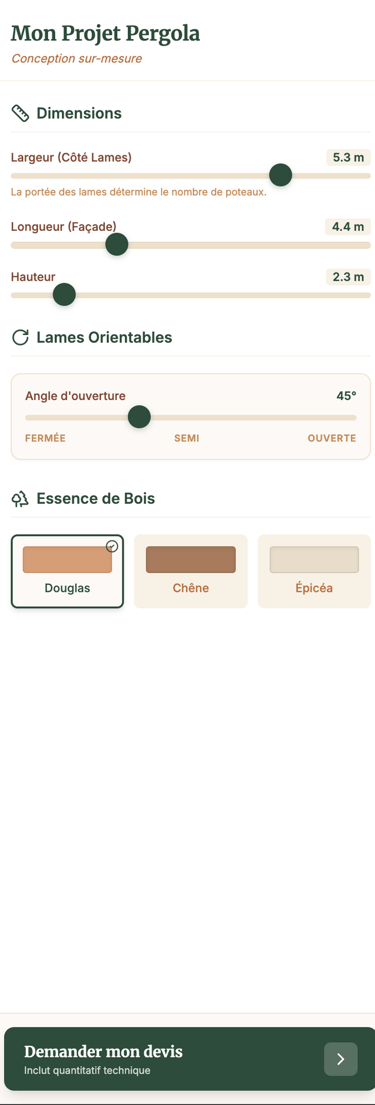 Chaque pergola étant unique (exposition, appui sur existant, contraintes climatiques, vent, charges, réglementation locale), la configuration réalisée sert de base d’échange pour affiner votre projet avec AtoutBois.