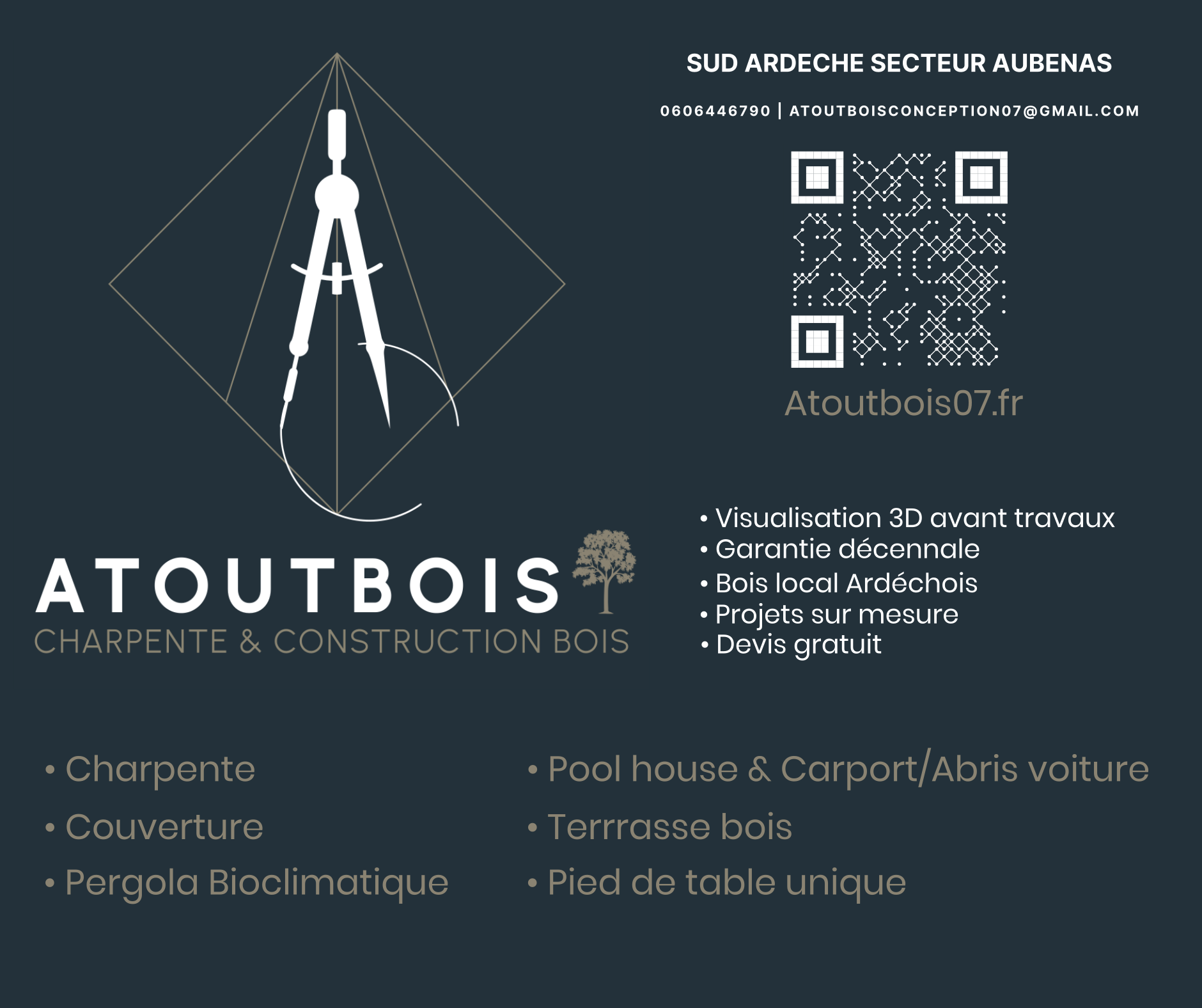 Notre entreprise est basée dans le sud Ardèche autour de Aubenas, spécialisée en charpente et couverture, ainsi qu'une boutique en ligne proposant des pieds de table uniques.